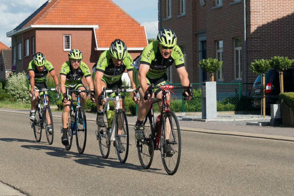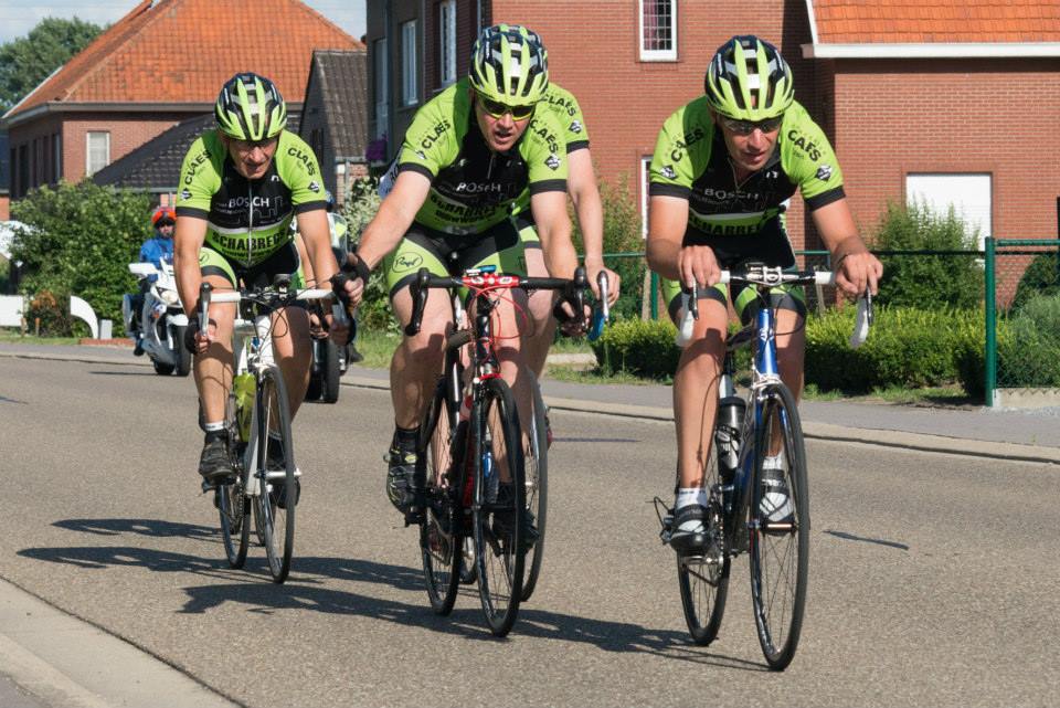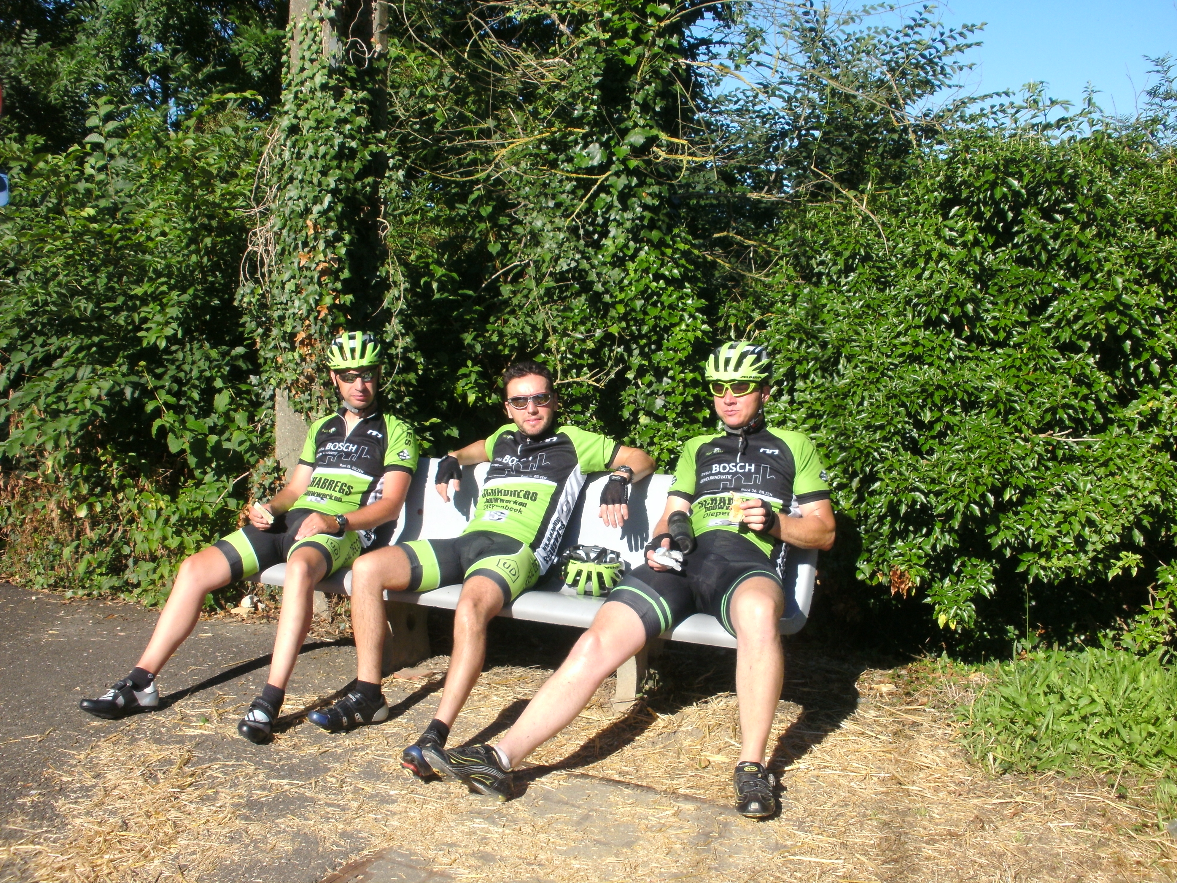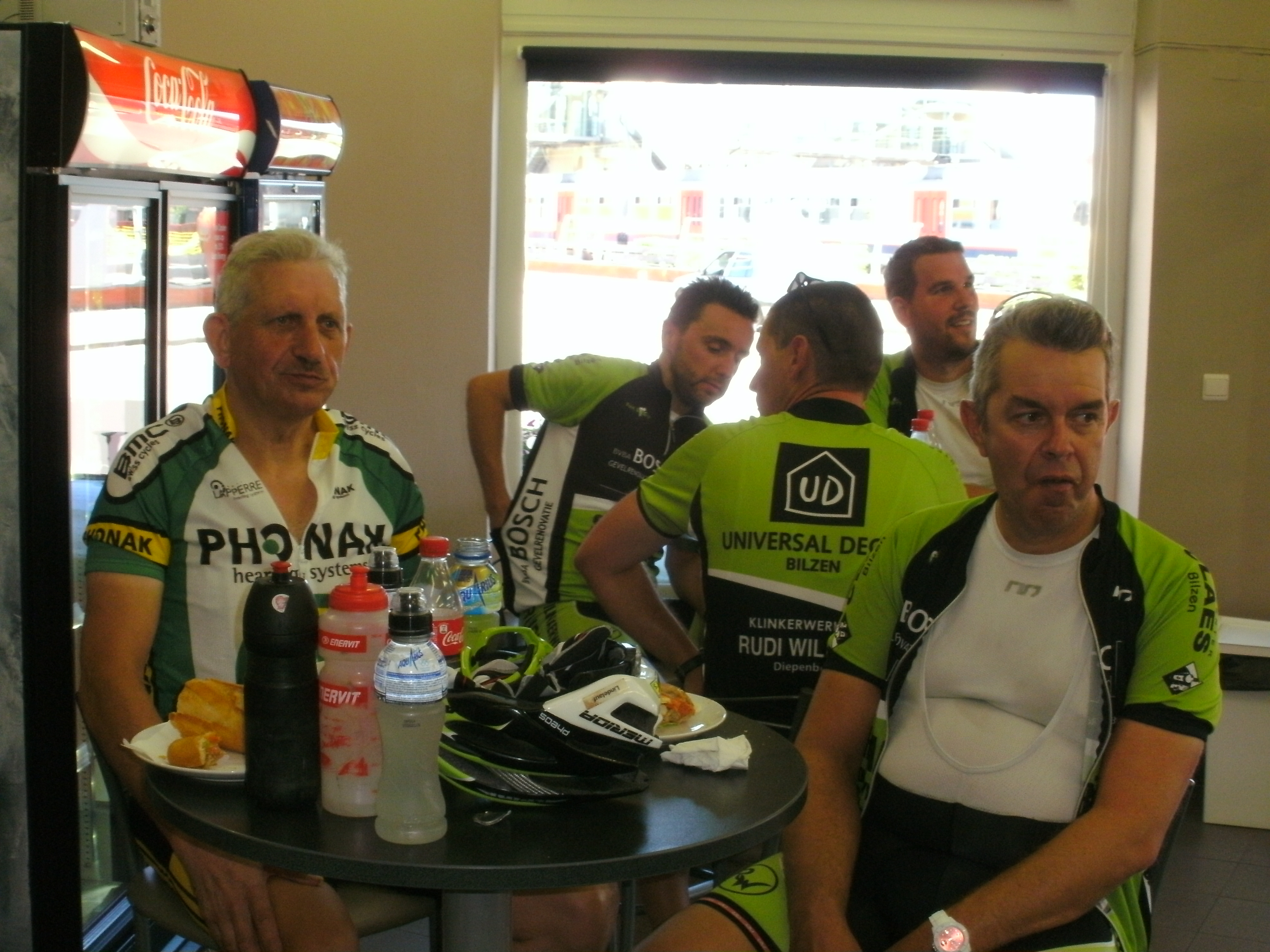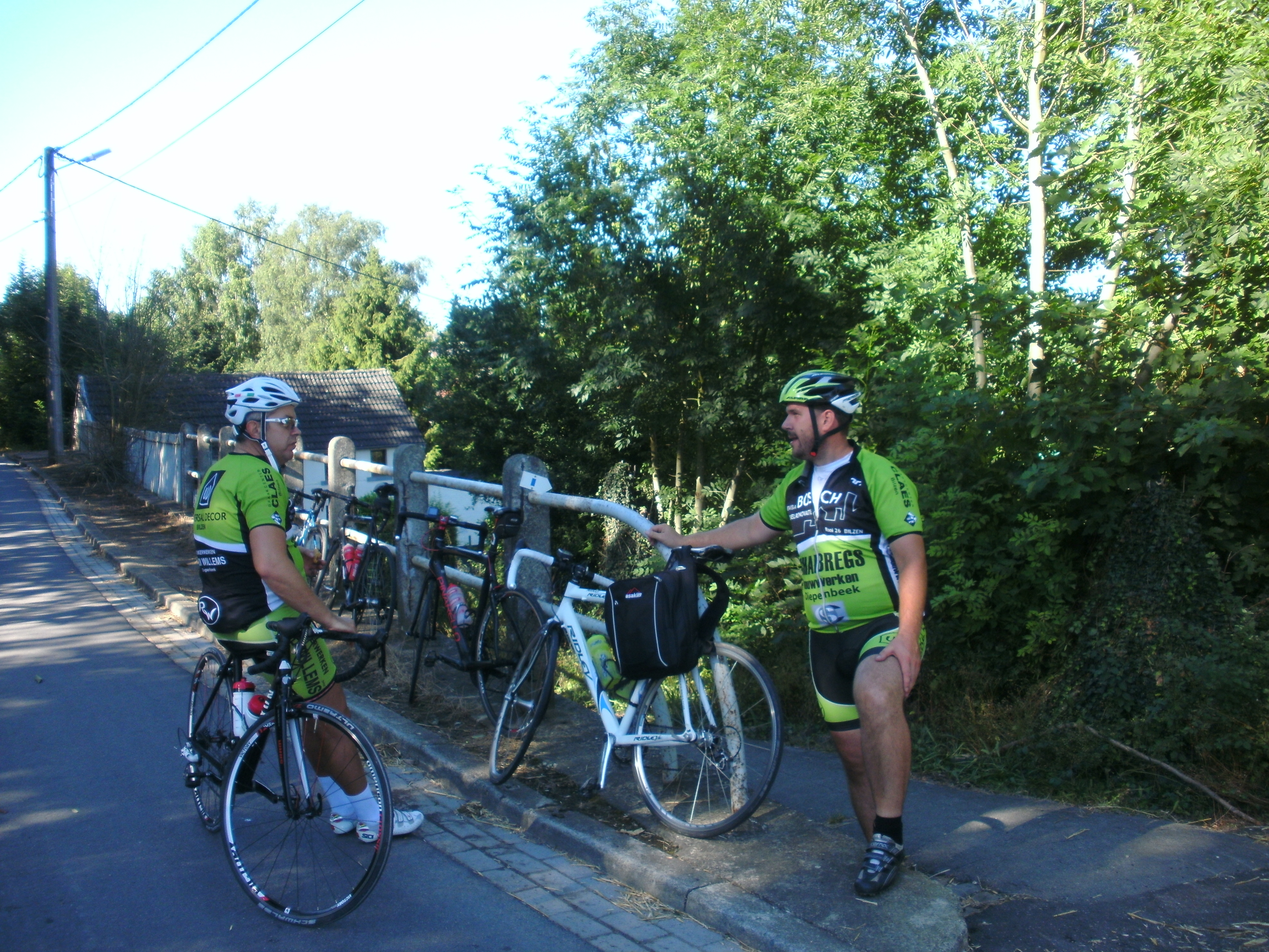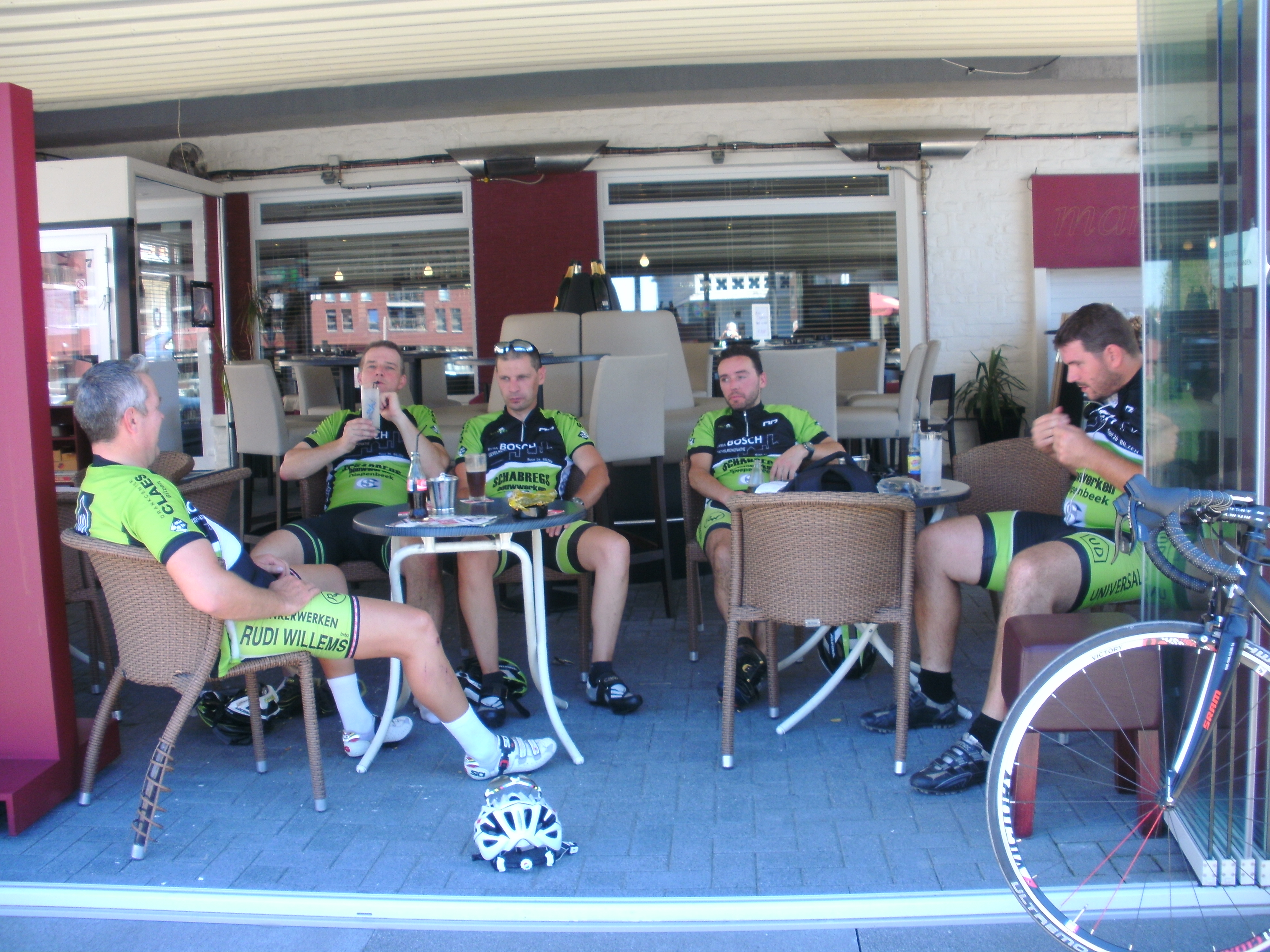 Vandaag een rit naar Gembloux 171 Km. gedaan samen met Bjorn, Ferdy, Jan, Johan en Luc. (Gino had mij gemaild dat hij samen met Berna een iets kortere rit ging doen omdat Berna wat sukkelt met zijn rug). Vertrokken om 7u30 aan café Bloemenhof te Munsterbilzen 3 man (ikzelf, Johan en Luc) aan de watertoren in Rooi Ferdy en Jan meegenomen en in schalkhoven ook nog Bjorn mee op de kar laten springen. Onze eerste stop was in Jandrain na 53 km, waar we onze eerste boterhammetjes soldaat maakten, ondertussen was de temperatuur al redelijk wat naar omhoog aan ’t gaan. Daarna flink doorgereden richting Gembloux waar we na 82 km in de broodjesbar geserveerd door twee lieftallige dames een lekker broodje en een cola (sommigen 2 waaronder ik) hebben genuttigd. Op de terugweg van Gembloux had ik een fietspad (Ravel) voorzien van maar liefst 35 km tot in Landen, waar we onze derde stop hielden op een terras aan het station. Ondertussen was de temperatuur al opgelopen tot 34 graden. We besloten dan ook om het tempo , wat tot nog toe redelijk boven de 26 km per uur lag terug te brengen naar zeker niet hoger dan 25 km per uur. Aan het kasteel van Rullingen hadden we onze voorlaatste stop op ongeveer 25 km van onze traditionele laatste stop (café ’t Smidje te Munsterbilzen). Al bij al weer een zeer mooie en geslaagde rit, ondanks de afstand en de temperatuur. En het was zeker een goede training en team building van de B-Ploeg (Bjorn, Ferdy, Johan, Pierre, en Peter die er vandaag niet bij was) voor de tijdrit van zaterdag te Spurk. Klik op de afbeeldingen voor meer info.