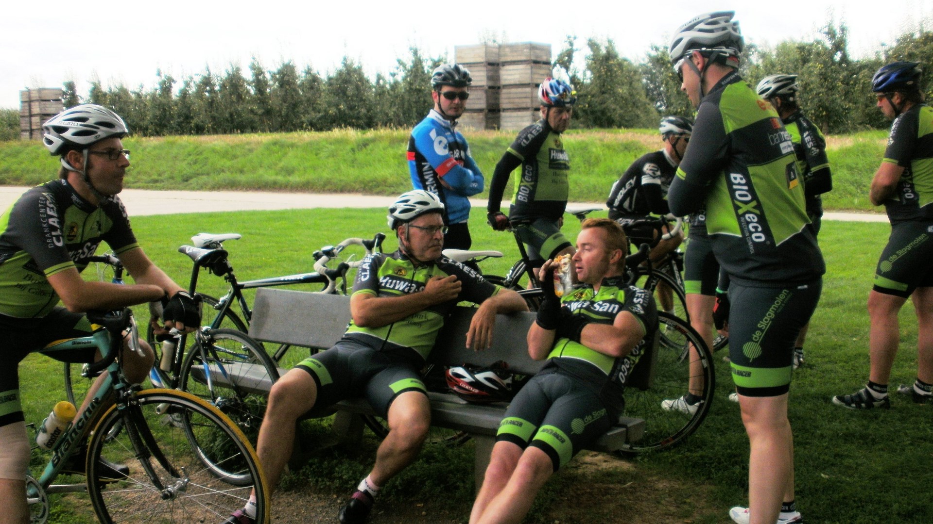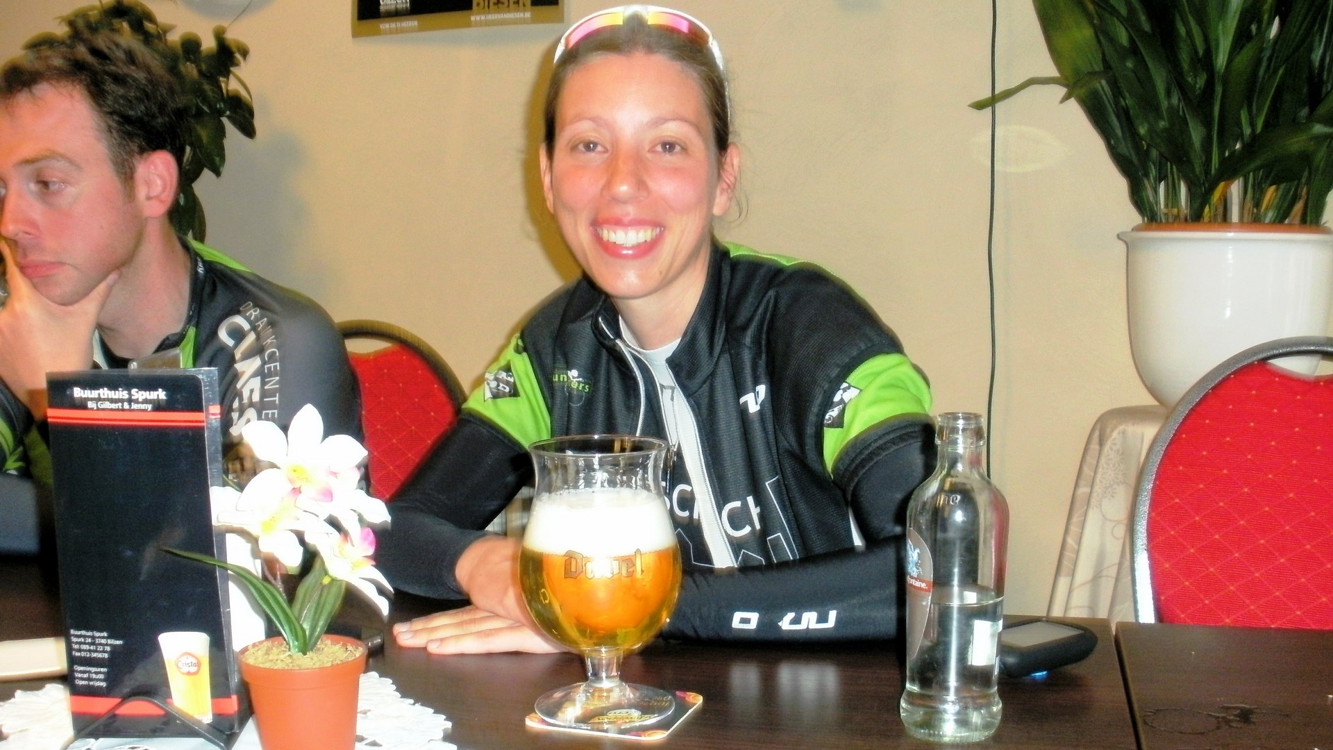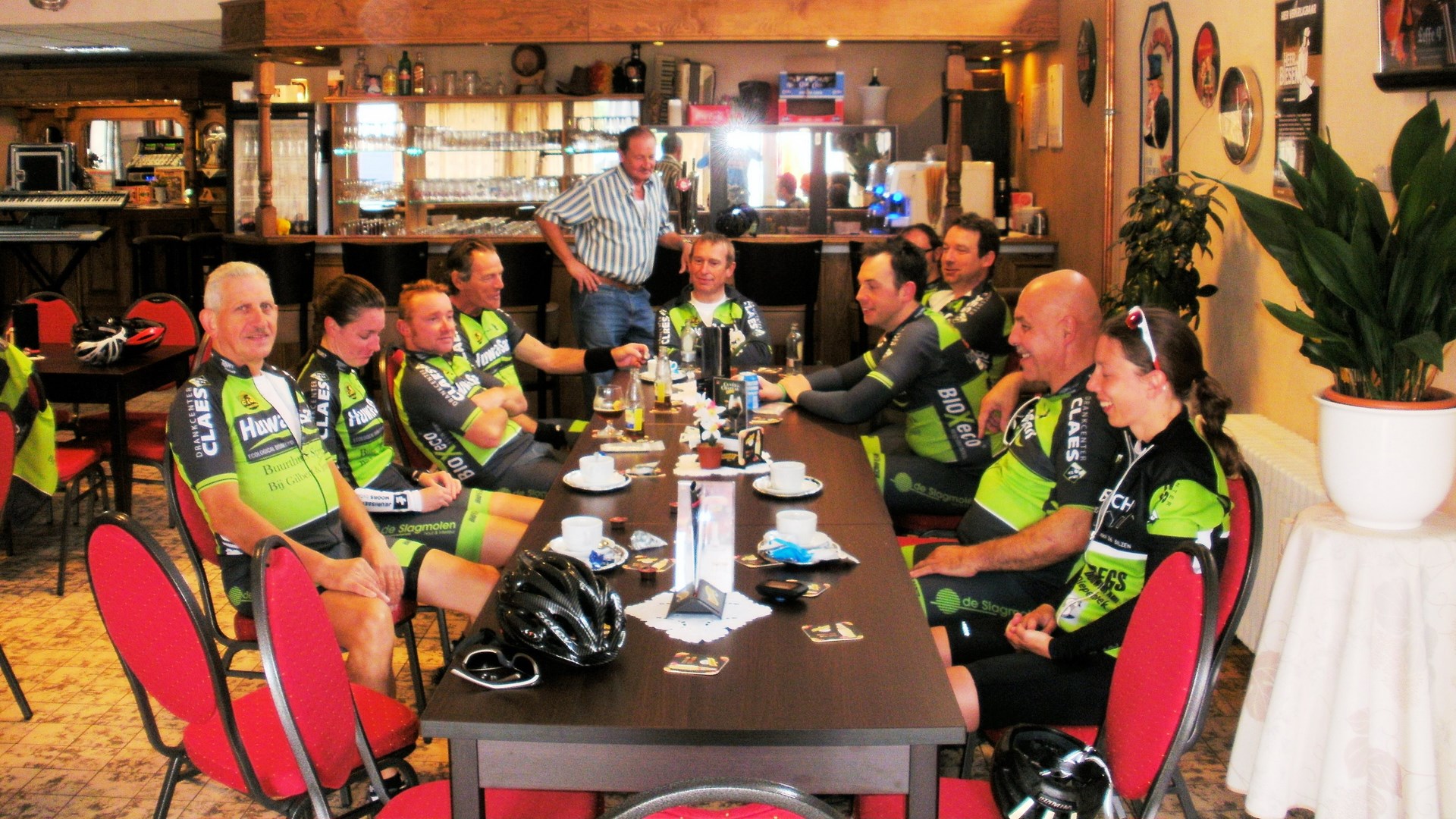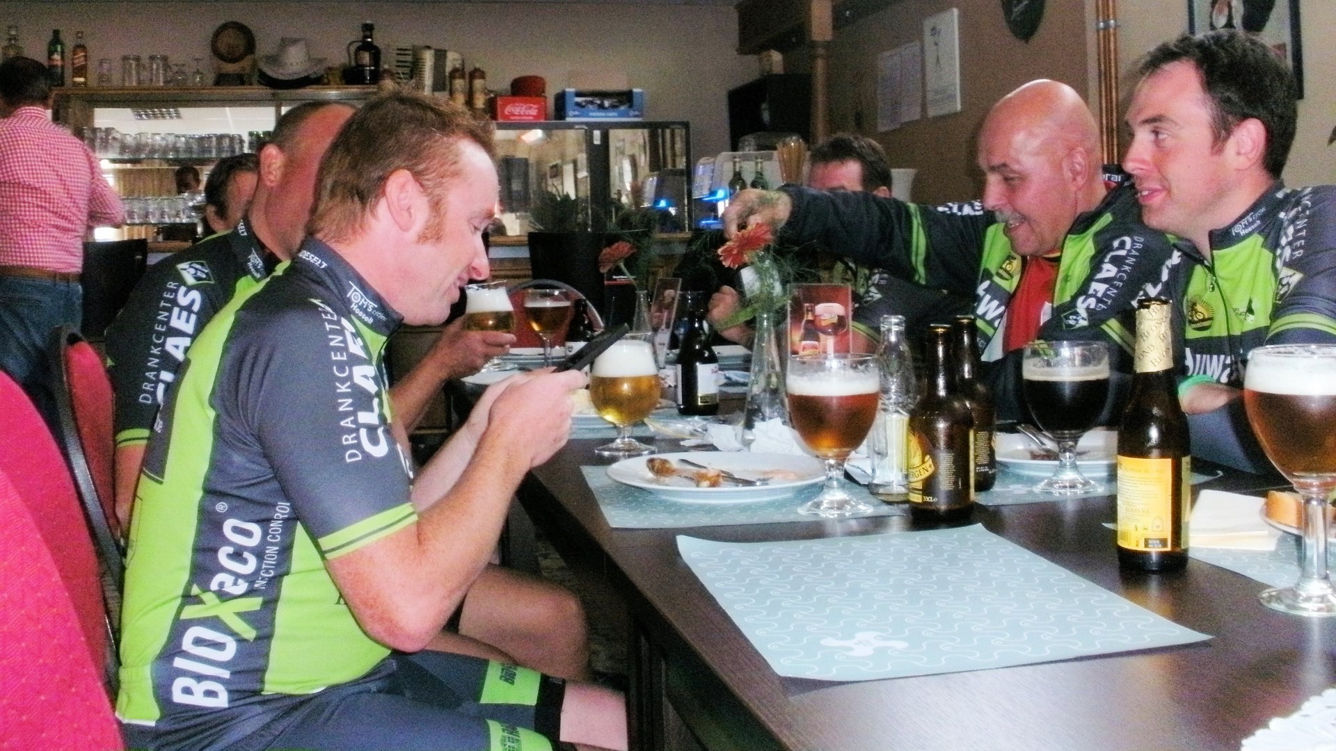 Vandaag de clubrit van WTC De Zonnekloppers naar Brustem 74 Km. gedaan. Met 14 vertrekkers waren we vandaag voor een vrij vlakke rit, maar met sommige momenten toch een strakke wind. In Brustem dachten sommigen dat ik het parcours langs ” De Chaussée D’amour” had gelegd. Niet dus, we hebben de ganse rit twee knappe dames (Hilde en Nele) in ons midden in een mooie strakke koers outfit. Blijkbaar zijn sommigen toch ziende blind!. Was ook weer een gezellige afsluiter bij Jenny en Gilbert in Het Buurthuis. Ook Nele met een ferme Duvel voor zich en Hilde met een Blonde Leffe (maar dat mocht nog niet op de gevoelige plaat vastgelegd worden).