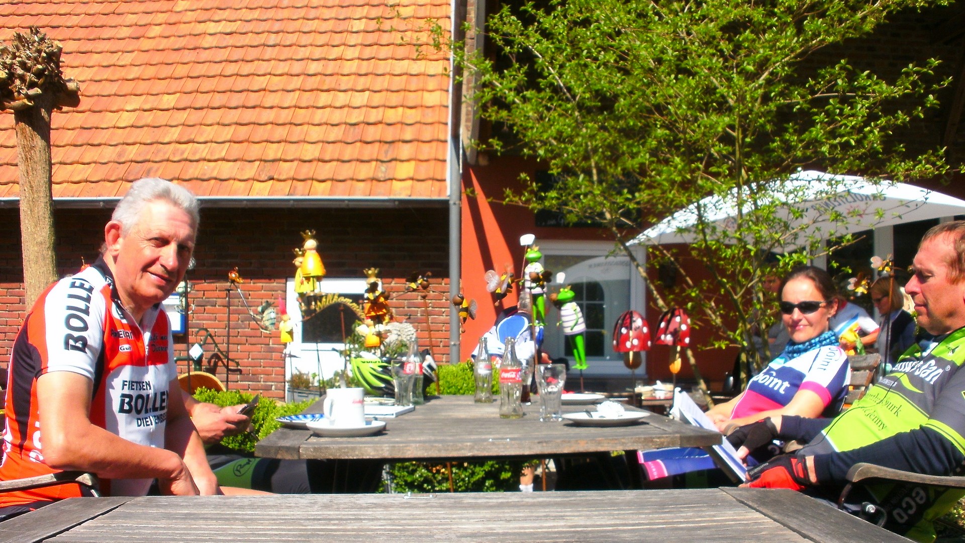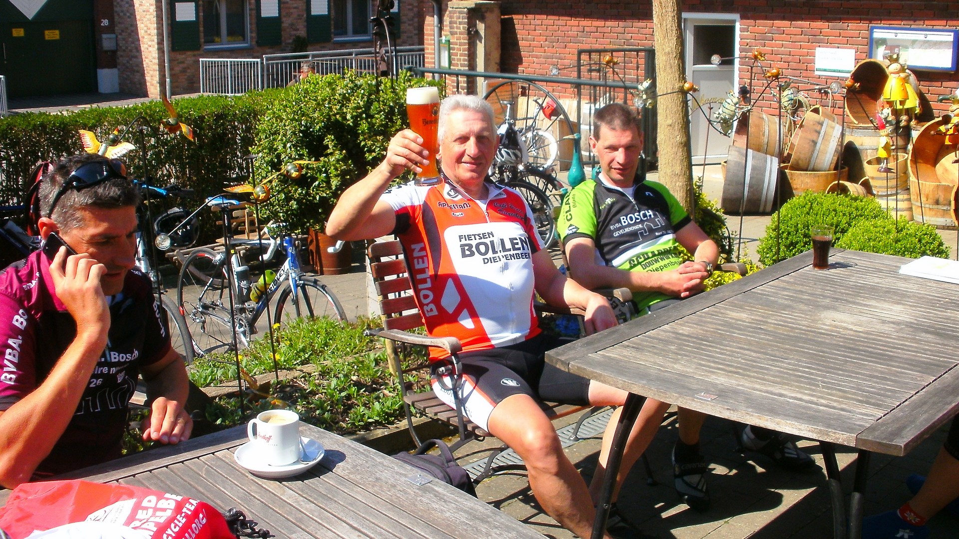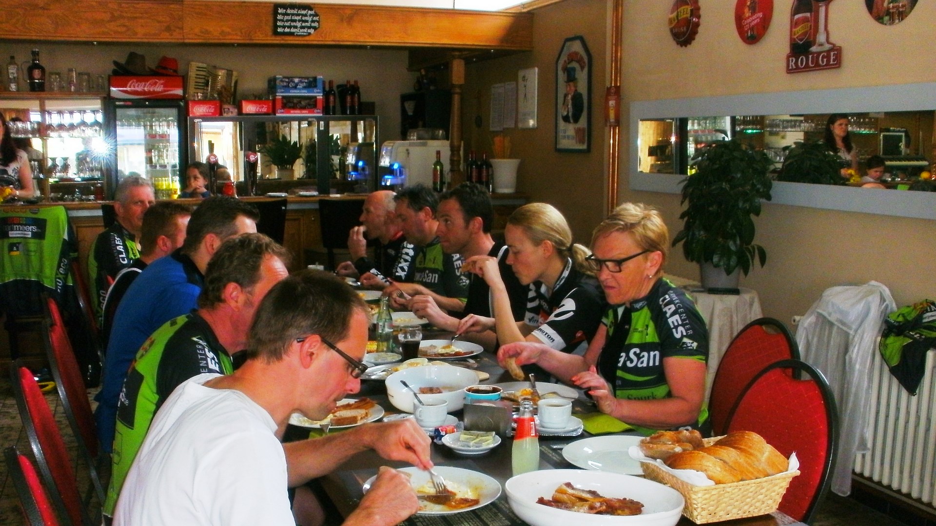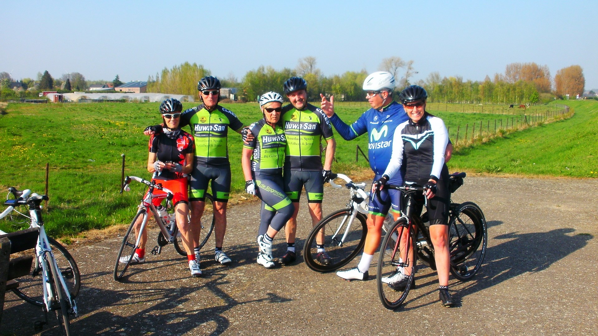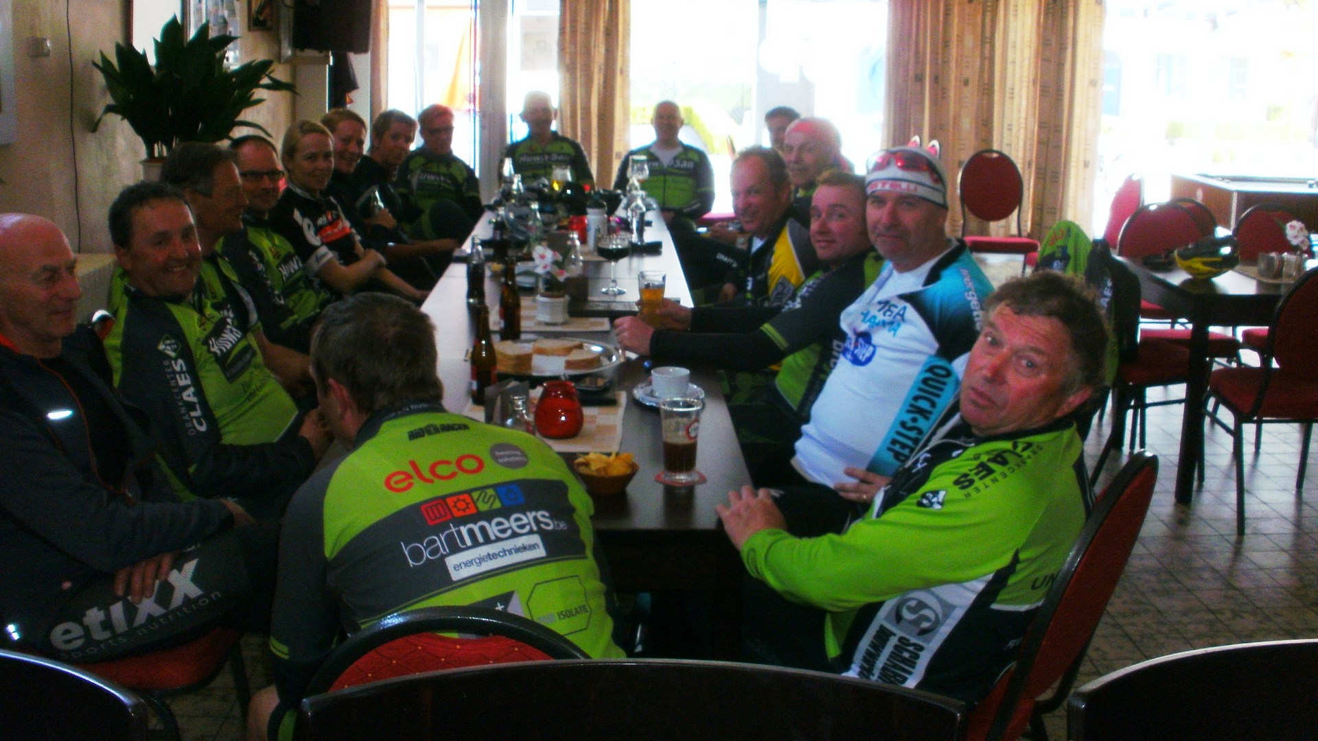 Vandaag onze achtste clubrit gedaan naar Maasband (NL) 62 Km. Met 16 vertrekkers vandaag (2 Dames en 14 Heren). Vlakke rit met op de terugweg enkel de klim van de Duivelsberg te Opgrimbie. En zoals altijd weer een zeer gezellige afsluiter bij Jenny en Gilbert in het buurthuis. Met nog een tractatie op spek en eieren van onze jarige Jean Hensen. Het verslag van de rit zal verzorgd worden door Geert Martin te bekijken op onze website WTC De Zonnekloppers. Klik op de afbeeldingen voor meer info.