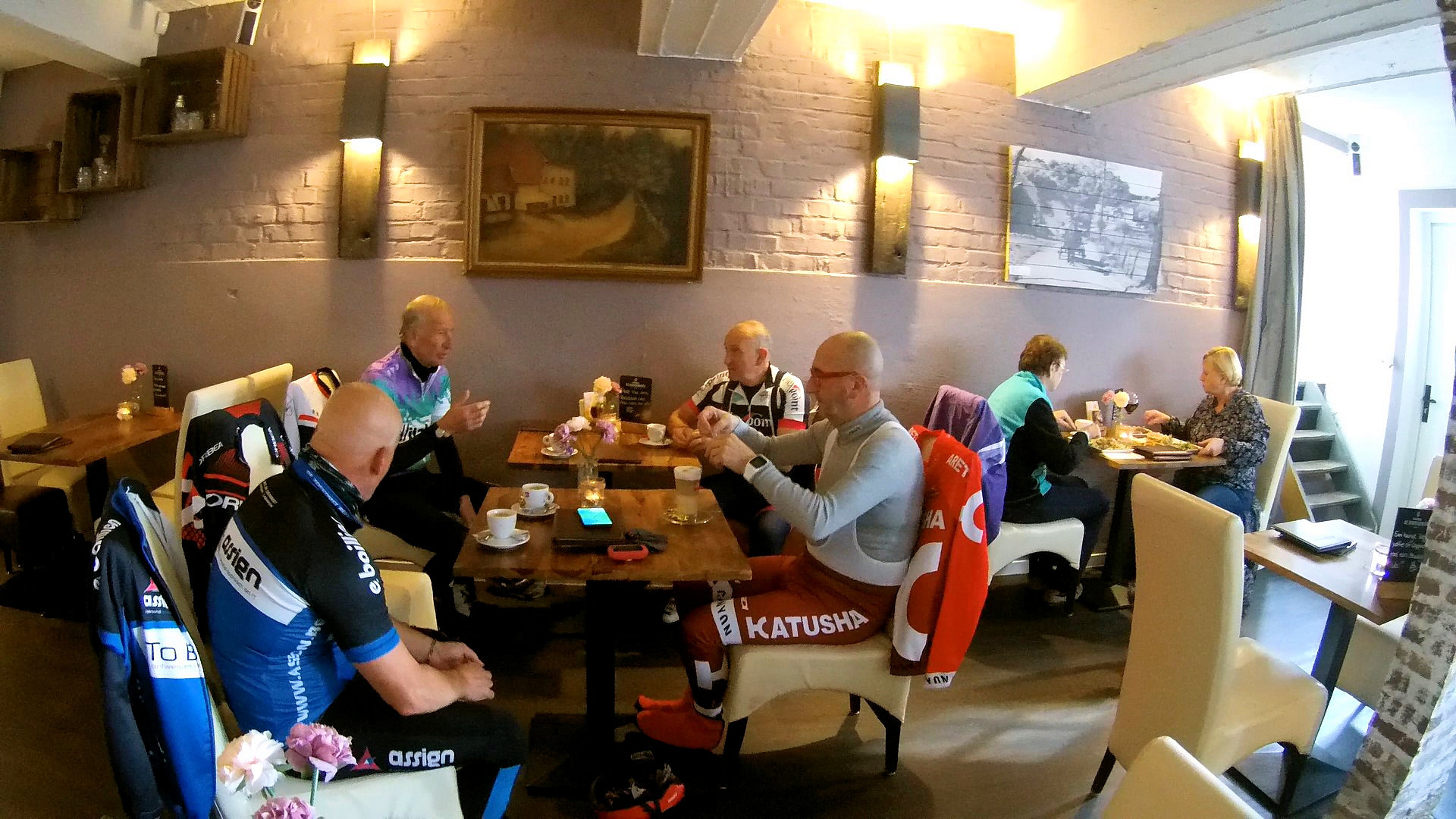 Vandaag een rit naar Vaesrade (NL) 93 Km. gedaan samen met Edwin Marting, Freddy Wijnen, Johnny Merken en Johny Muffels. Johny heeft aangepikt in Gellik. Met een koffie en vlaai stop in “Brasserie De Muldermolen” na 46 Km. te Schinnen met alweer een aangename en vriendelijke bediening. Redeijk pittige rit vandaag met (519 Hm. GPS) maar weer prachtig fietsweer. Met nog een afsluiter bij Café Jengske te Heesveld.