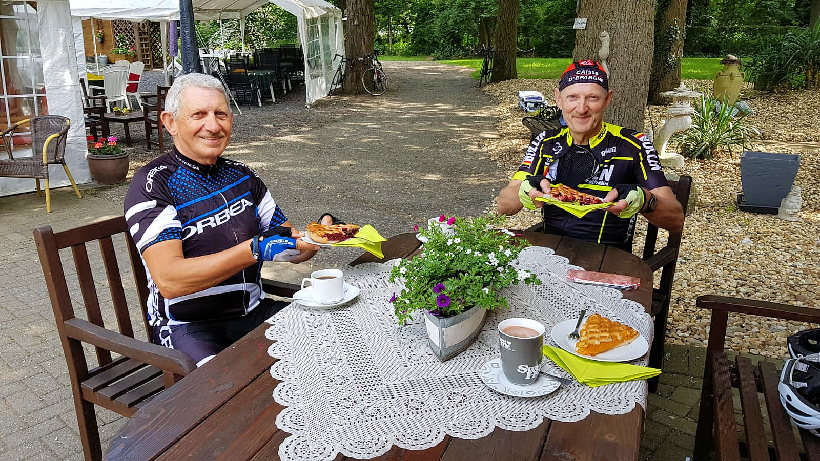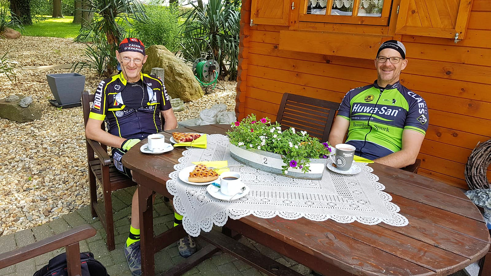 Met een eerste boterham stop in Shinnen na 41 Km. Op het terras in “Café Diecker Fahrradtreff” te Selfkant (DE) na 67 Km. onze koffie stop met heerlijke vlaai gehouden.