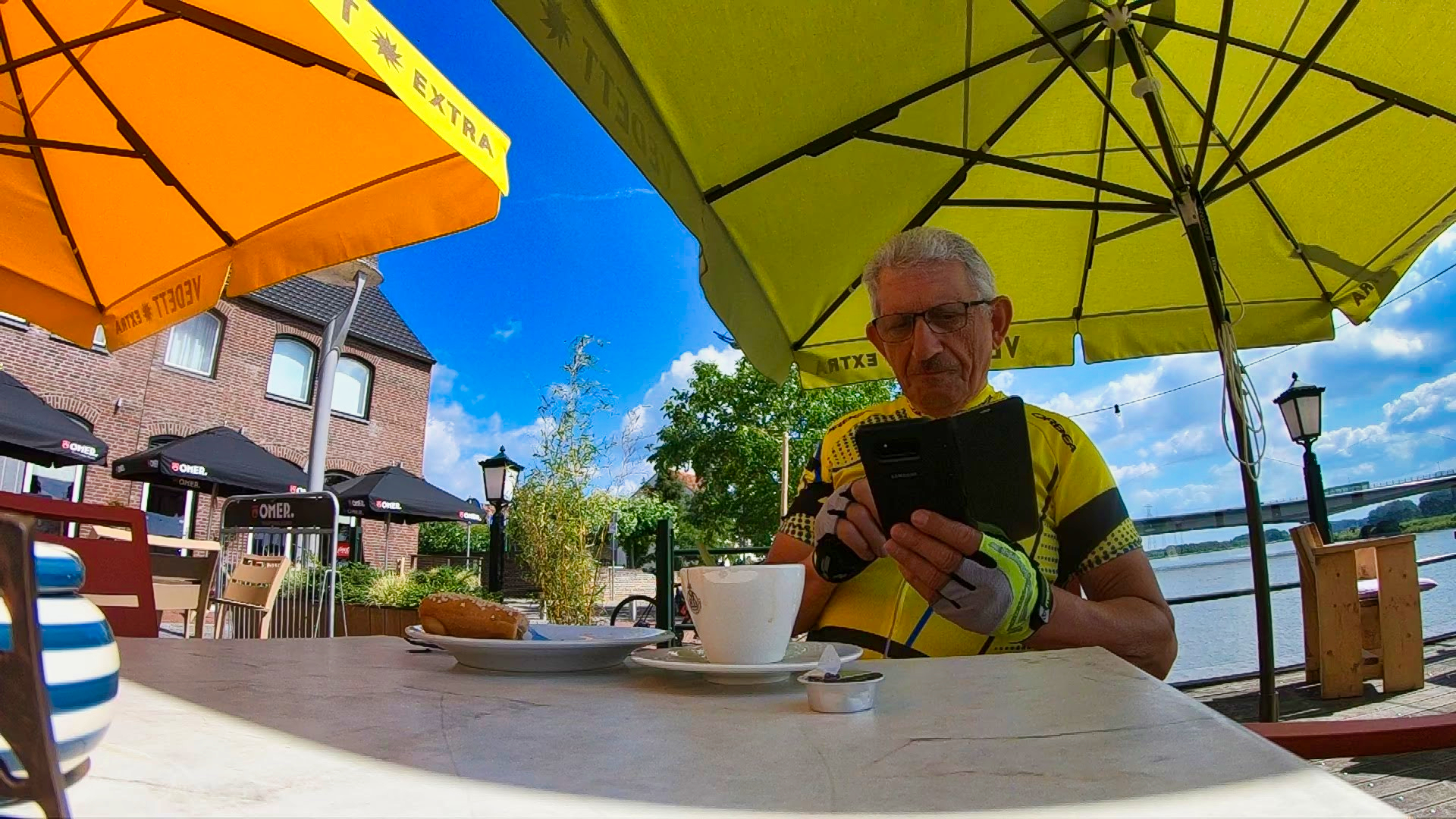Vandaag een rit naar Wessem (NL) 128 Km. gedaan, solo. Mooie vlakke rit met een eerste stop na 42 Km. langs de Maas voor Heppeneert. In Wessem na 70 Km bij “’t Veerhuis” weer genoten op een zonnig terras, en de innerlijke mens versterkt met koffie vlaai.